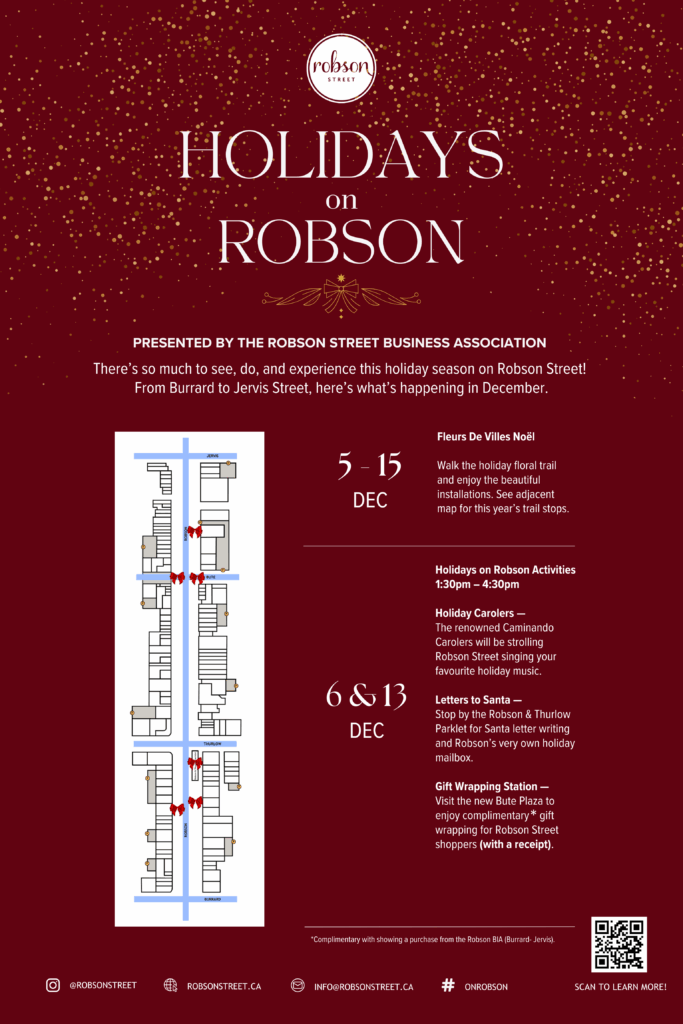 There’s something special about Robson Street in December. The lights, the bustle, the familiar songs in the air—everything feels a little warmer, even on the coldest days. This year, the Robson Street Business Association is bringing that festive spirit back with Holidays on Robson, a community event designed for families, shoppers, and anyone who enjoys a little seasonal cheer.